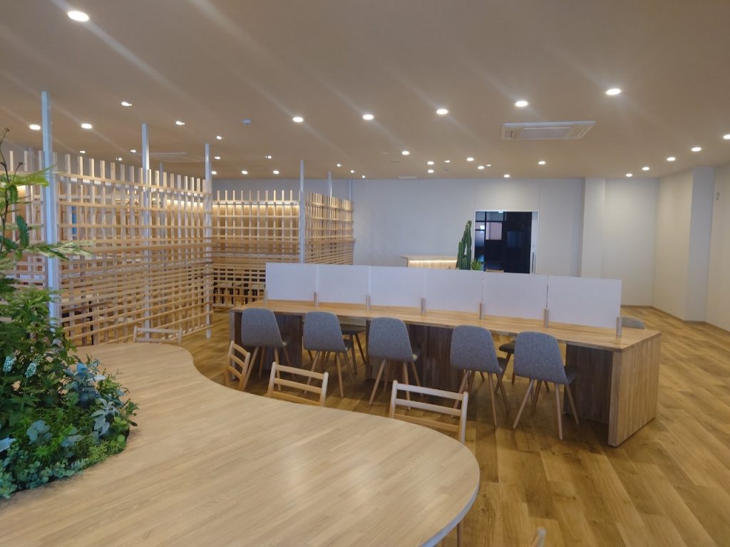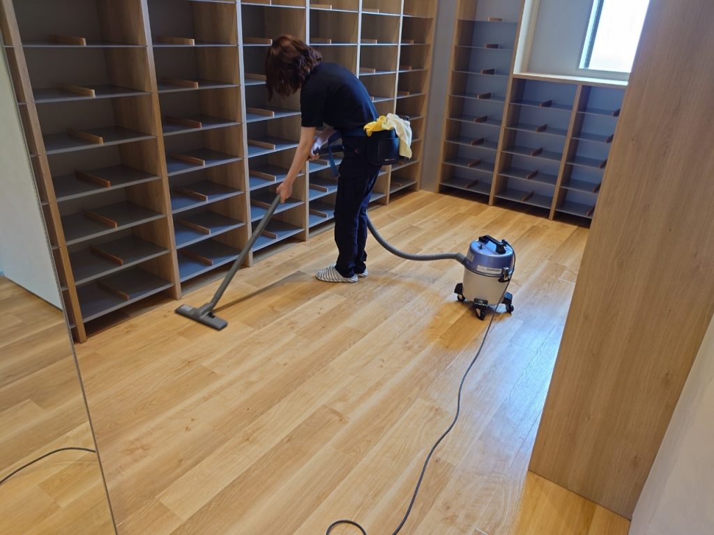 内装リフォーム工事会社さんからの御依頼。工事後の仕上げクリーニング作業。全体の除埃、拭きあげ作業。気持ちよく社員さん達が食事を取れるよう清潔な空間に仕上げます。